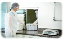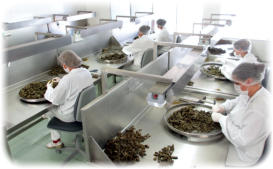 使用不锈钢桌和用具,为原材料做选择和分类。